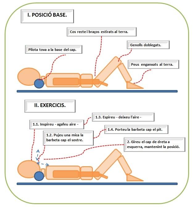 Consideracions alhora de fer els exercicis: afluixeu les mandíbules, els ulls, feu el moviment d’una manera molt lenta sense forçar la respiració ni la velocitat de l’exercici.